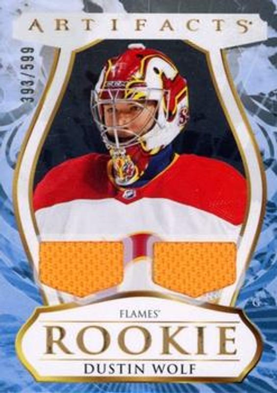 The Dustin Wolf 2023 Upper Deck Artifacts #182 Material - Gold /199 Rookie card is 1 of 36 Dustin Wolf's card variations in the 2023 Upper Deck Artifacts set being tracked by Sports Card Investor, including Base /999, Leather, Plexi, Turquoise, and Wood.