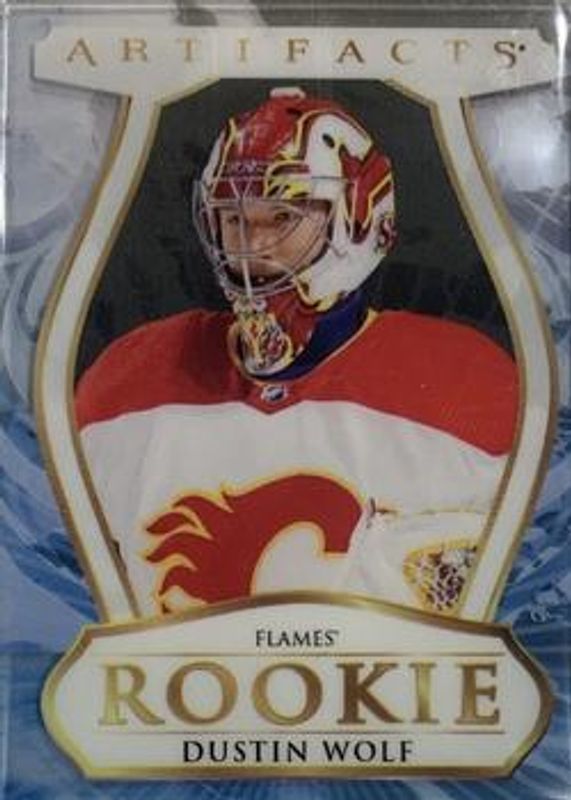 The Dustin Wolf 2023 Upper Deck Artifacts #182 Plexi Rookie card is 1 of 36 Dustin Wolf's card variations in the 2023 Upper Deck Artifacts set being tracked by Sports Card Investor, including Base /999, Leather, Turquoise, Wood, and Ruby /499.