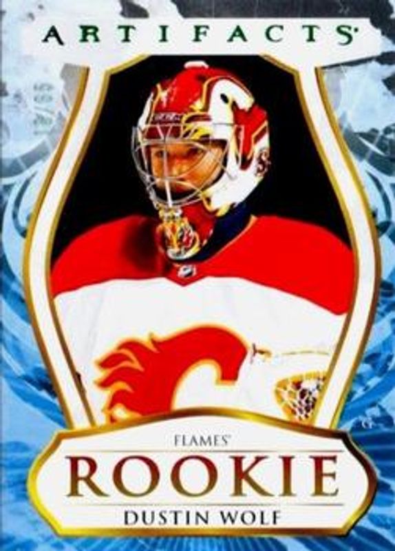 The Dustin Wolf 2023 Upper Deck Artifacts #182 Polychrome /65 Rookie card is 1 of 36 Dustin Wolf's card variations in the 2023 Upper Deck Artifacts set being tracked by Sports Card Investor, including Base /999, Leather, Plexi, Turquoise, and Wood.
