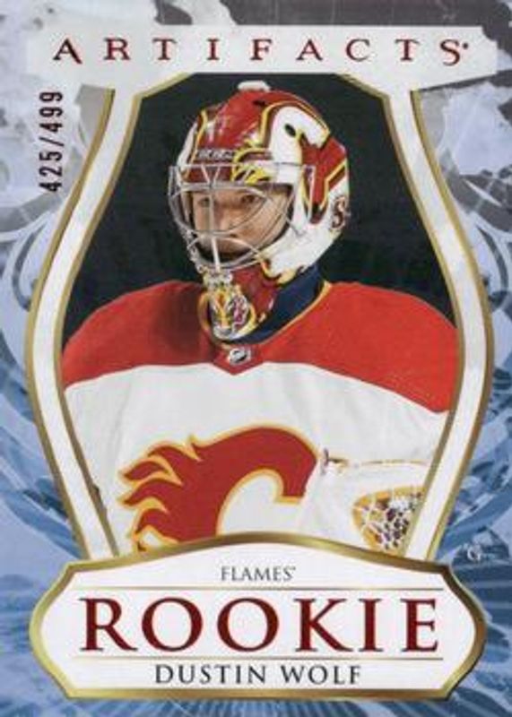 The Dustin Wolf 2023 Upper Deck Artifacts #182 Ruby /499 Rookie card is 1 of 36 Dustin Wolf's card variations in the 2023 Upper Deck Artifacts set being tracked by Sports Card Investor, including Base /999, Leather, Plexi, Turquoise, and Wood.
