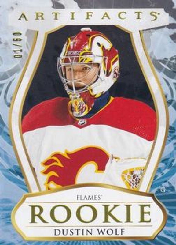 The Dustin Wolf 2023 Upper Deck Artifacts #182 Yellow /50 Rookie card is 1 of 36 Dustin Wolf's card variations in the 2023 Upper Deck Artifacts set being tracked by Sports Card Investor, including Base /999, Leather, Plexi, Turquoise, and Wood.
