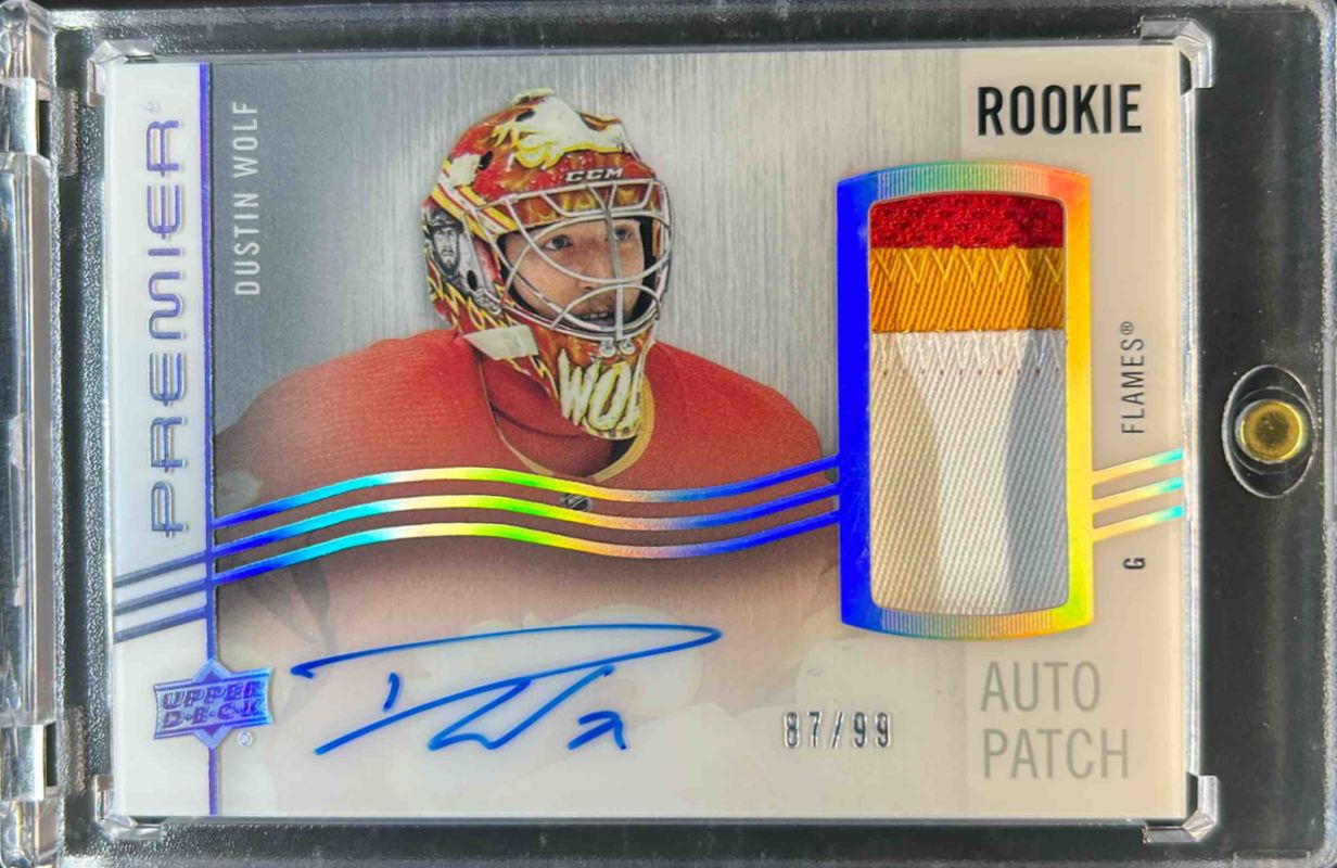 The Dustin Wolf 2023 Upper Deck Premier #AHR-DW Acetate Rookie Auto Patch Horizontal /49 card is 1 of 38 Dustin Wolf's card variations in the 2023 Upper Deck Premier set being tracked by Sports Card Investor, including Base /399, Bronze /199, Gold /65, Ruby /49, and Rose Gold /25.
