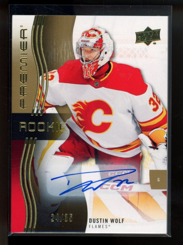 The Dustin Wolf 2023 Upper Deck Premier #117 Base Auto - Gold /35 Rookie card is 1 of 38 Dustin Wolf's card variations in the 2023 Upper Deck Premier set being tracked by Sports Card Investor, including Base /399, Bronze /199, Gold /65, Ruby /49, and Rose Gold /25.