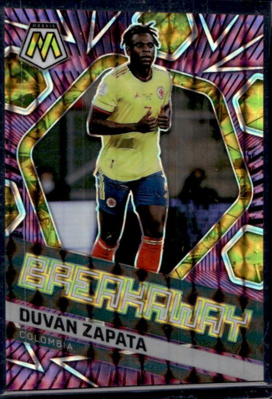 The Duvan Zapata 2021 Mosaic Road to FIFA World Cup #26 Breakaway - Purple /50 card is 1 of 25 Duvan Zapata's card variations in the 2021 Mosaic Road to FIFA World Cup set being tracked by Sports Card Investor, including Base, Blue Pulsar, Choice Red & Green, Gold Pulsar, and Reactive Blue.