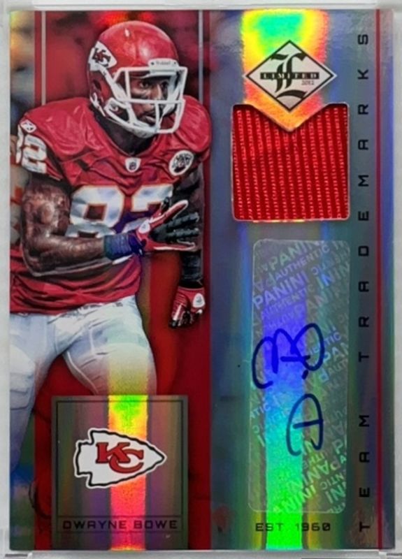 The Dwayne Bowe 2012 Limited #25 Team Trademarks Autographs Materials /10 card is 1 of 16 Dwayne Bowe's card variations in the 2012 Limited set being tracked by Sports Card Investor, including Base /199, Silver Spotlight /49, Gold Spotlight /25, Platinum Spotlight /1, and Threads /99.