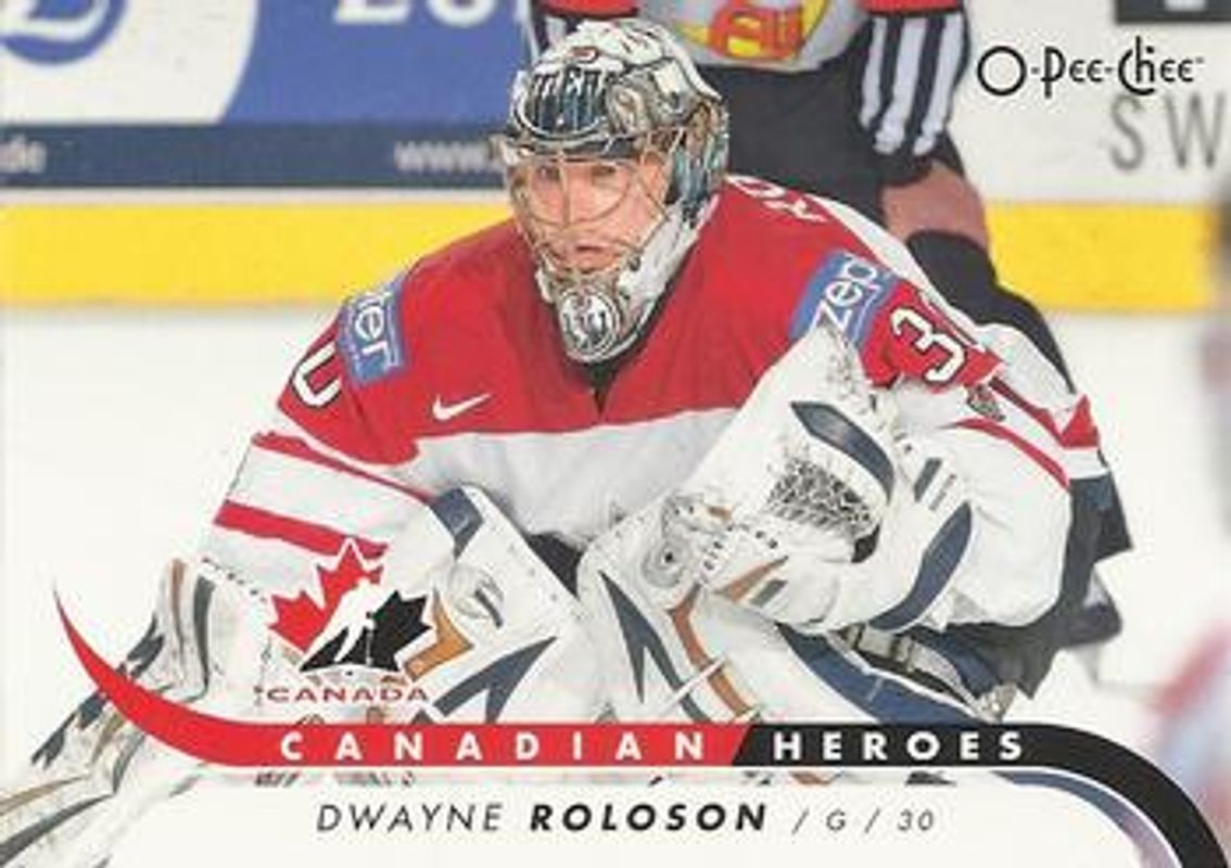 The Dwayne Roloson 2009 O-Pee-Chee #CB-DR Canadian Heroes card is 1 of 10 Dwayne Roloson's card variations in the 2009 O-Pee-Chee set being tracked by Sports Card Investor, including #619 Base, #104 Base, #619 Rainbow, #104 Rainbow, and #104 Retro.