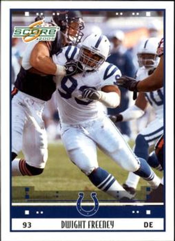 The Dwight Freeney 2005 Score #120 Base card is 1 of 6 Dwight Freeney's card variations in the 2005 Score set being tracked by Sports Card Investor, including Glossy, Scorecard /599, Adrenaline /399, Revolution /199, and Final Score /17.