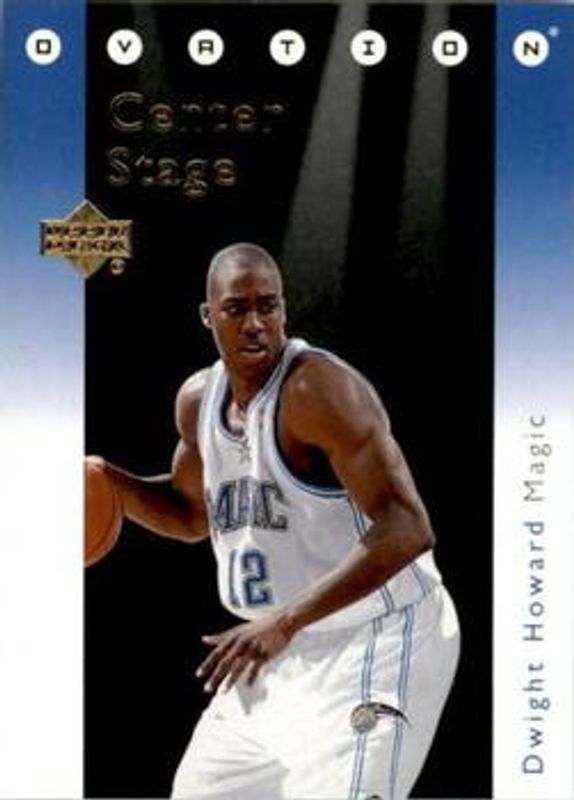 The Dwight Howard 2006 Upper Deck Ovation #CS-DH Center Stage card is 1 of 4 Dwight Howard's card variations in the 2006 Upper Deck Ovation set being tracked by Sports Card Investor, including Base /999, Gold /99, and Leading Performers.