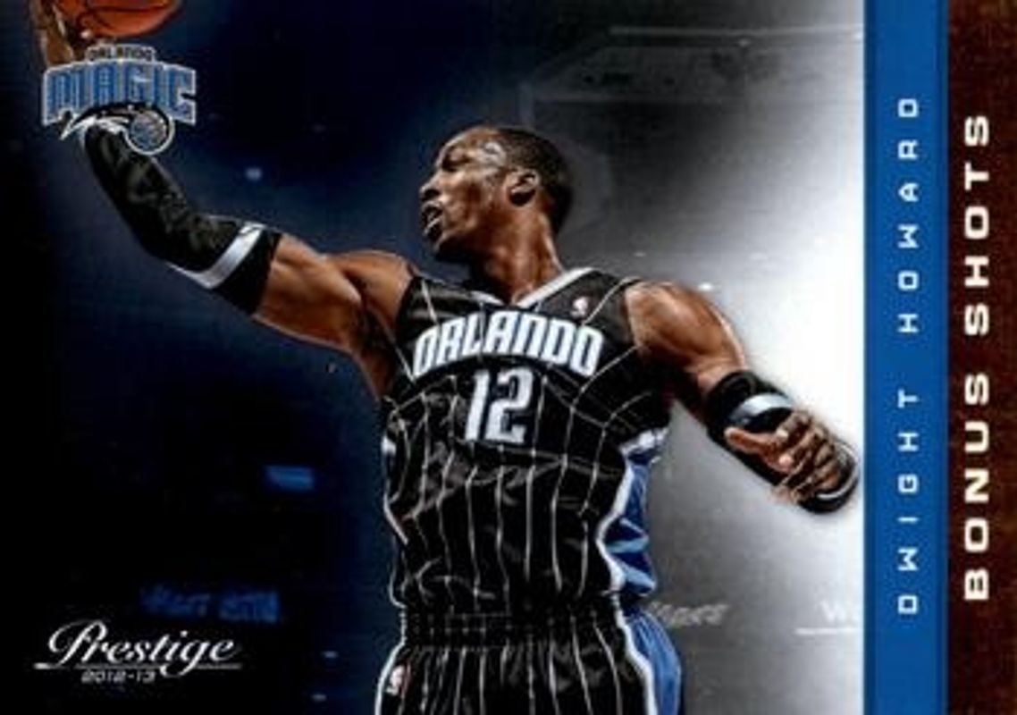 The Dwight Howard 2012 Prestige #72 Bonus Shots Gold /249 card is 1 of 14 Dwight Howard's card variations in the 2012 Prestige set being tracked by Sports Card Investor, including Base, Bonus Shots Black /10, All Stars East, Franchise Favorites, and Hardcourt Heroes.