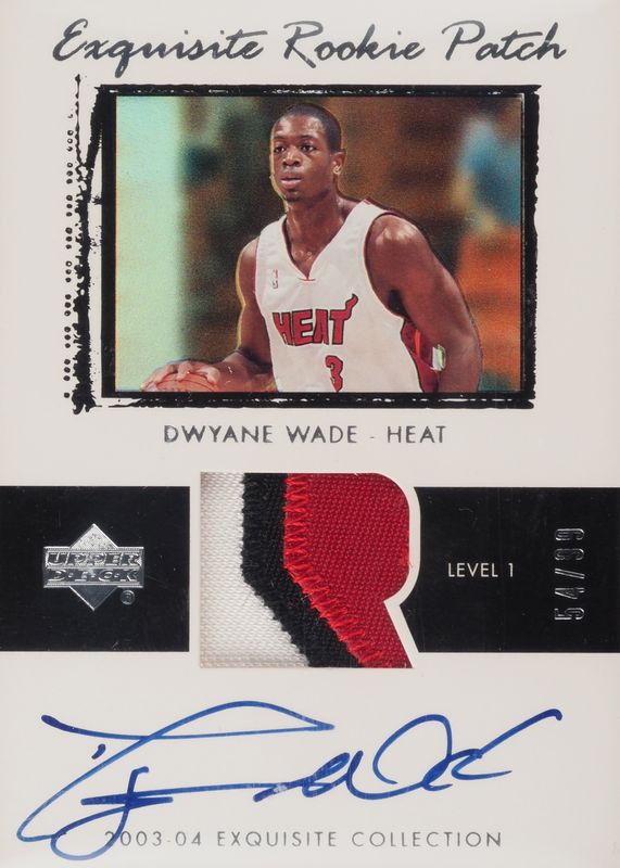 The Dwyane Wade 2003 Upper Deck Exquisite Collection #74 Rookie Patch Auto (/99) card in Raw condition has not changed in price in the last 30 days and was last sold for $19,620.00 .