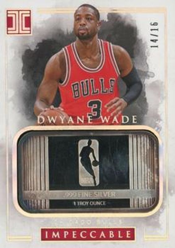 The Dwyane Wade 2016 Impeccable #78 Silver NBA Logo /16 card is 1 of 9 Dwyane Wade's card variations in the 2016 Impeccable set being tracked by Sports Card Investor, including Base /99, Holo Silver /25, Holo Gold /10, Platinum /1, and Indelible Ink /75.