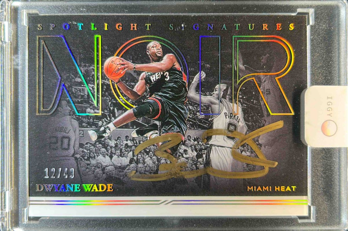 The Dwyane Wade 2020 Noir #SSH-DWD Spotlight Signatures - Horizontal /99 card is 1 of 12 Dwyane Wade's card variations in the 2020 Noir set being tracked by Sports Card Investor, including Icons Memorabilia /99, Snapshot Signatures /99, Sneaker Spotlight Signatures /99, Newsreels Jerseys /75, and Spotlight Signatures /49.
