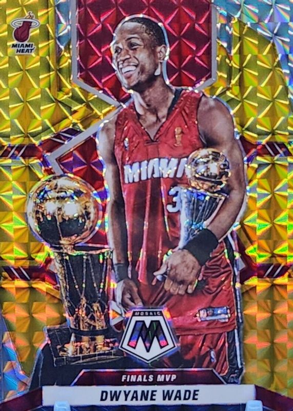 The Dwyane Wade 2021 Mosaic #299 Finals MVPs - Gold /10 card in Raw condition has not changed in price in the last 30 days and was last sold for $99.99 .