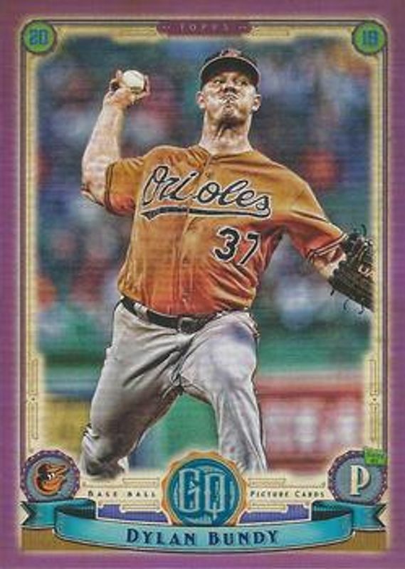 The Dylan Bundy 2019 Topps Gypsy Queen #142 Purple card is 1 of 29 Dylan Bundy's card variations in the 2019 Topps Gypsy Queen set being tracked by Sports Card Investor, including #232 Base, #142 Base, #232 Bazooka Back, #142 Bazooka Back, and #232 GQ Logo Swap.