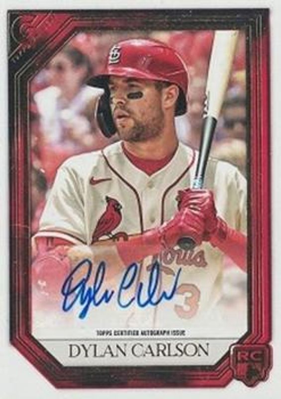 Dylan Carlson's Baseball cards are available in at least 56 sets. Dylan Carlson's biggest 7-day price movers are 2021 Topps Gallery #RA-DC Rookies Autographs - Red /1, 2021 Topps Gallery #197 Red Pattern /1, and 2021 Topps Luminaries #HK-DC Hit Kings Autographs - Black /1.