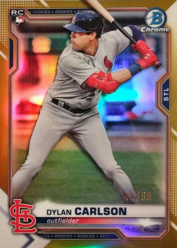 The Dylan Carlson 2021 Bowman Chrome #45 Gold Refractor /50 Rookie card in Raw condition has not changed in price in the last 30 days and was last sold for $8.60 .