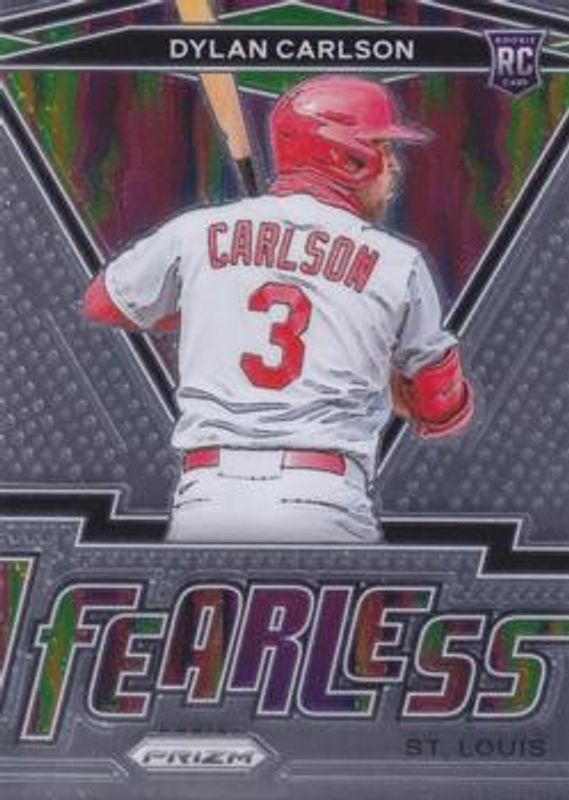 The Dylan Carlson 2021 Prizm #FR-3 Fearless Rookie card is 1 of 112 Dylan Carlson's card variations in the 2021 Prizm set being tracked by Sports Card Investor, including Base, Blue, Blue Velocity, Carolina Blue, and Cosmic Haze.