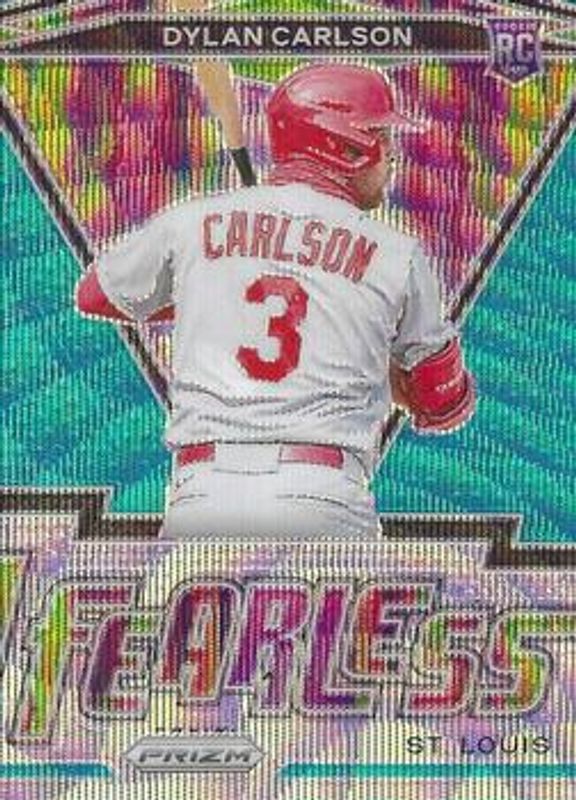 The Dylan Carlson 2021 Prizm #FR-3 Fearless - Teal Wave Rookie card is 1 of 112 Dylan Carlson's card variations in the 2021 Prizm set being tracked by Sports Card Investor, including Base, Blue, Blue Velocity, Carolina Blue, and Cosmic Haze.