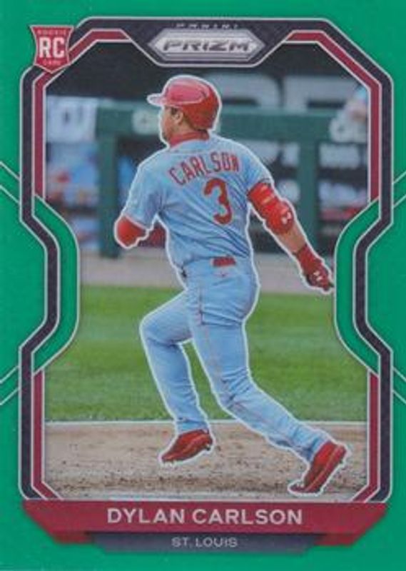 The Dylan Carlson 2021 Prizm #138 Green Rookie card is 1 of 112 Dylan Carlson's card variations in the 2021 Prizm set being tracked by Sports Card Investor, including Base, Blue, Blue Velocity, Carolina Blue, and Cosmic Haze.