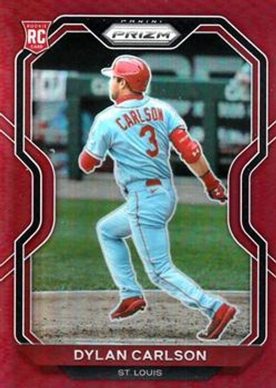 The Dylan Carlson 2021 Prizm #138 Red Rookie card is 1 of 112 Dylan Carlson's card variations in the 2021 Prizm set being tracked by Sports Card Investor, including Base, Blue, Blue Velocity, Carolina Blue, and Cosmic Haze.