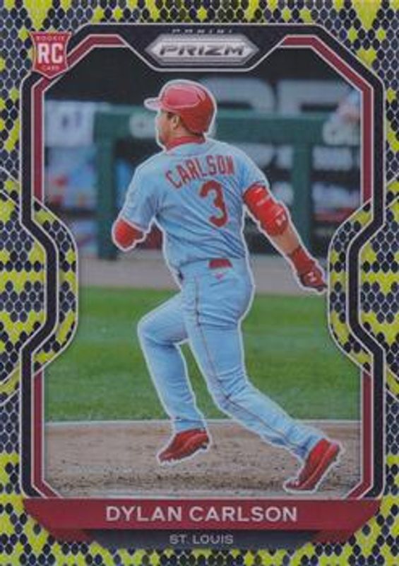 The Dylan Carlson 2021 Prizm #138 Snakeskin /50 Rookie card is 1 of 112 Dylan Carlson's card variations in the 2021 Prizm set being tracked by Sports Card Investor, including Base, Blue, Blue Velocity, Carolina Blue, and Cosmic Haze.