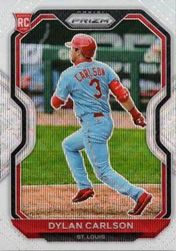 The Dylan Carlson 2021 Prizm #138 White Wave Rookie card is 1 of 112 Dylan Carlson's card variations in the 2021 Prizm set being tracked by Sports Card Investor, including Base, Blue, Blue Velocity, Carolina Blue, and Cosmic Haze.