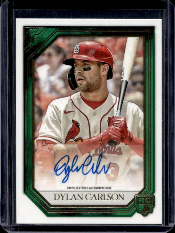The Dylan Carlson 2021 Topps Gallery #RA-DC Rookies Autographs - Green /99 card is 1 of 27 Dylan Carlson's card variations in the 2021 Topps Gallery set being tracked by Sports Card Investor, including Base, Printer Proof, Rainbow Foil, Private Issue /250, and Green /125.