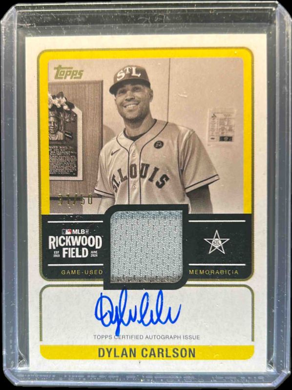 The Dylan Carlson 2025 Topps #RWAR-DC Rickwood Autographs Relics /50 card is 1 of 12 Dylan Carlson's card variations in the 2025 Topps set being tracked by Sports Card Investor, including Rickwood Relics, Rickwood Relics - Blue /150, Rickwood Relics - Gold /50, Rickwood Autographs Relics - Orange /25, and Rickwood Relics - Orange /25.
