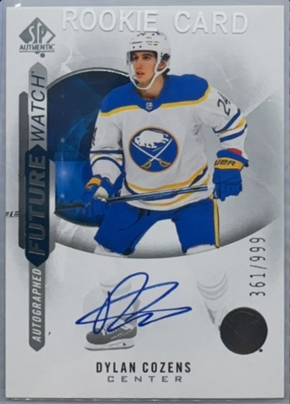 The Dylan Cozens 2020 SP Authentic #208 Base /999 Rookie card is 1 of 13 Dylan Cozens' card variations in the 2020 SP Authentic set being tracked by Sports Card Investor, including Black Gold Ink, Future Watch Acetate, 2020 Upper Deck Young Guns Acetate, Spectrum FX, and Future Watch Auto /999.