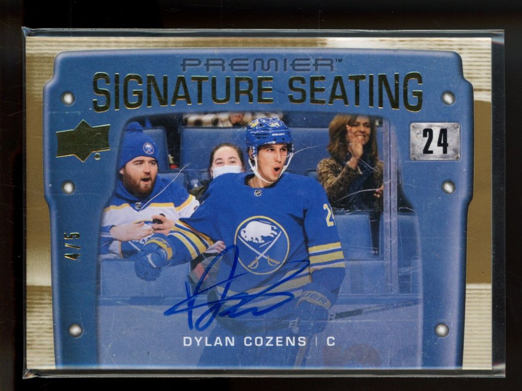 The Dylan Cozens 2021 Upper Deck Premier #PSS-DC Premier Signatures Seats Stars - Gold /5 card is 1 of 28 Dylan Cozens' card variations in the 2021 Upper Deck Premier set being tracked by Sports Card Investor, including Base /399, Gold /199, Platinum /1, 2020 Upper Deck Premier Update: - Silver Spectrum, and Autographs.
