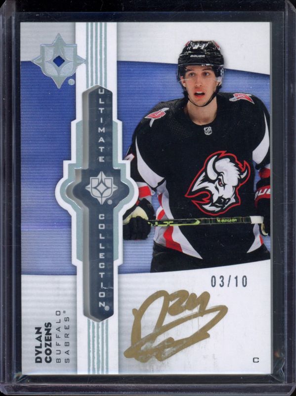 The Dylan Cozens 2022 Upper Deck Ultimate Collection #UE-DC Ultimate Emblems Auto Platinum /10 card is 1 of 4 Dylan Cozens' card variations in the 2022 Upper Deck Ultimate Collection set being tracked by Sports Card Investor, including Ultimate Emblems - Auto, Signatures Material Laureates /49, and Ultimate Emblems - Auto Gold /49.