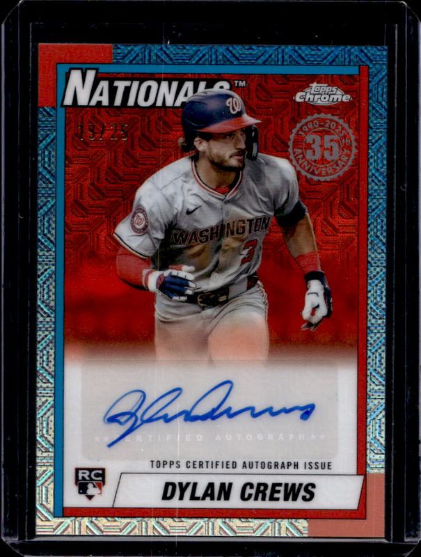 The Dylan Crews 2025 Topps #90CA-DC 1990 Baseball Chrome Silver Pack Autographs (Series 1) - Orange Refractor /25 Rookie card is 1 of 290 Dylan Crews' card variations in the 2025 Topps set being tracked by Sports Card Investor, including Base, Aqua Holo Foil, Aqua Rainbow, Diamante Foil, and Eggs.