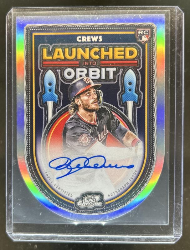 The Dylan Crews 2025 Topps Chrome Cosmic #LIOA-DC Launched Into Orbit Autographs Rookie card is 1 of 90 Dylan Crews' card variations in the 2025 Topps Chrome Cosmic set being tracked by Sports Card Investor, including Base, Nucleus Refractor, Refractor, Aqua Equinox Refractor /199, and Purple Nebula Refractor /150.