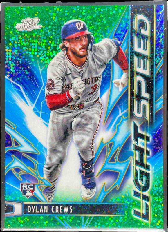 The Dylan Crews 2025 Topps Chrome Cosmic #LS-13 Light Speed - Green Space Dust Refractor /75 Rookie card is 1 of 90 Dylan Crews' card variations in the 2025 Topps Chrome Cosmic set being tracked by Sports Card Investor, including Base, Nucleus Refractor, Refractor, Aqua Equinox Refractor /199, and Purple Nebula Refractor /150.