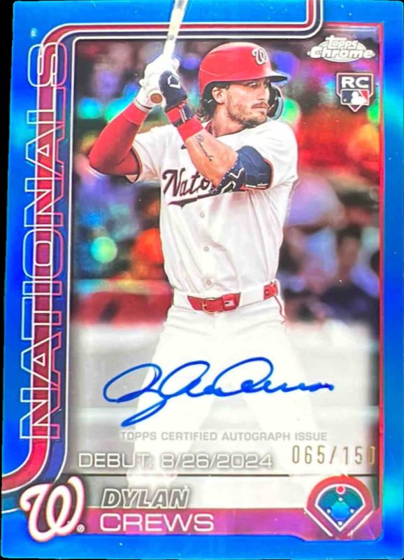 The Dylan Crews 2025 Topps Chrome Update #CRDA-DC Rookie Debut Autographs - Blue Refractor /150 card is 1 of 164 Dylan Crews' card variations in the 2025 Topps Chrome Update set being tracked by Sports Card Investor, including Base, Image Variation, Rookie Debut, Geometric Refractor, and Negative Refractor.