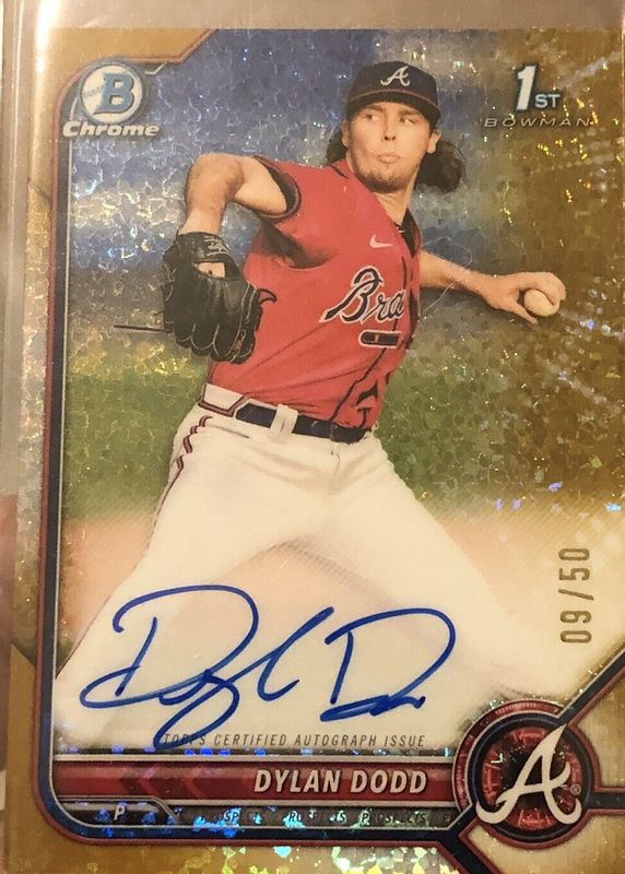 The Dylan Dodd 2022 Bowman Chrome #CPA-DD Prospect Auto - Gold Mini-Diamond Refractor /50 (1st) card in Raw condition has not changed in price in the last 30 days and was last sold for $275.00 .