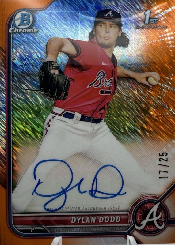 The Dylan Dodd 2022 Bowman Chrome #CPA-DD Prospect Auto - Orange Shimmer Refractor /25 (1st) card in Raw condition has not changed in price in the last 30 days and was last sold for $45.00 .