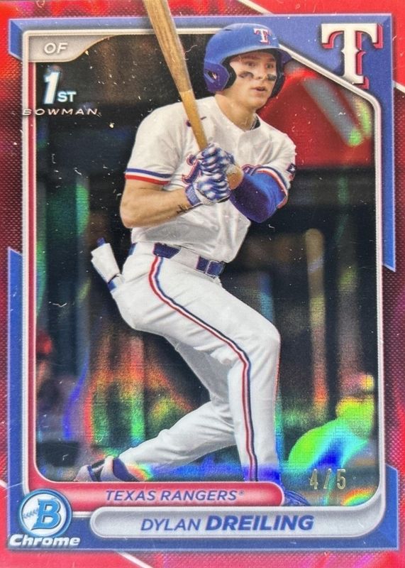The Dylan Dreiling 2024 Bowman Draft #BDC-42 Chrome - Red Refractor /5 (1st) card in Raw condition has not changed in price in the last 30 days and was last sold for $100.00 .