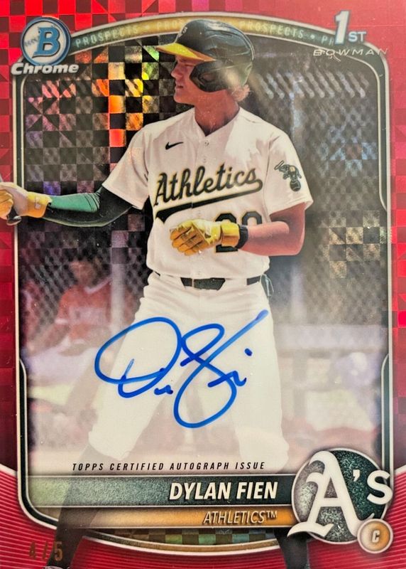 The Dylan Fien 2025 Bowman #CPA-DF Chrome Prospect Auto - Red X-Fractor /5 (1st) card in Raw condition has not changed in price in the last 30 days and was last sold for $210.00 .