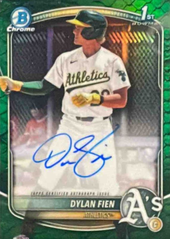 The Dylan Fien 2025 Bowman #CPA-DF Chrome Prospect Auto - Reptilian Green Refractor /99 (1st) card in Raw condition has not changed in price in the last 30 days and was last sold for $22.50 .