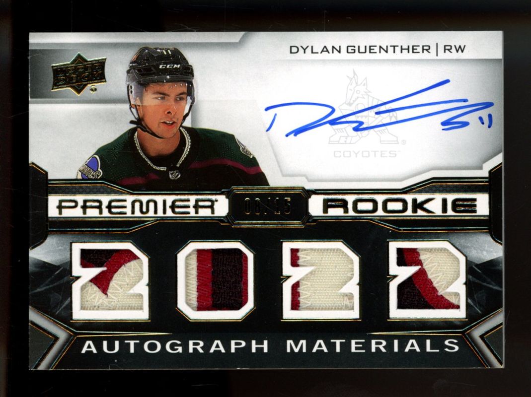 The Dylan Guenther 2022 Upper Deck Premier #PRA-DG 2022 Premier Rookie Auto Jersey - Patch /15 card is 1 of 39 Dylan Guenther's card variations in the 2022 Upper Deck Premier set being tracked by Sports Card Investor, including Base /399, Autographs, Jersey, Rookies Bronze /199, and Gold /65.