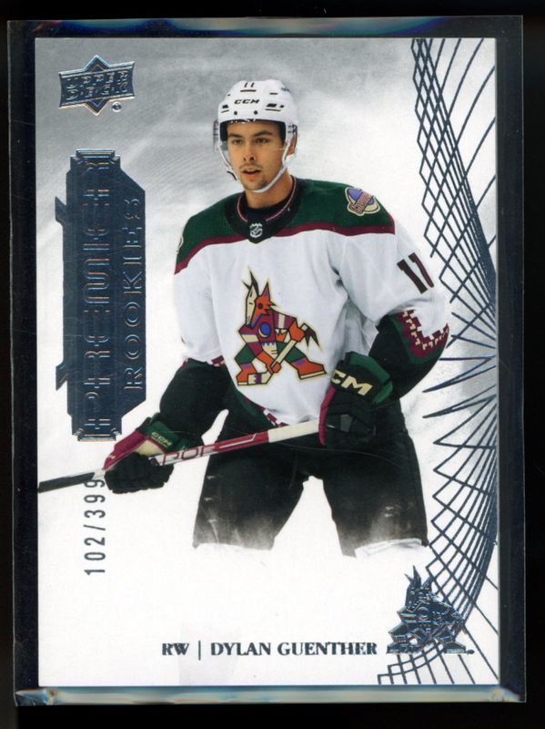 The Dylan Guenther 2022 Upper Deck Premier #129 Base /399 Rookie card is 1 of 39 Dylan Guenther's card variations in the 2022 Upper Deck Premier set being tracked by Sports Card Investor, including Autographs, Jersey, Rookies Bronze /199, Gold /65, and Premium Memorabilia /49.