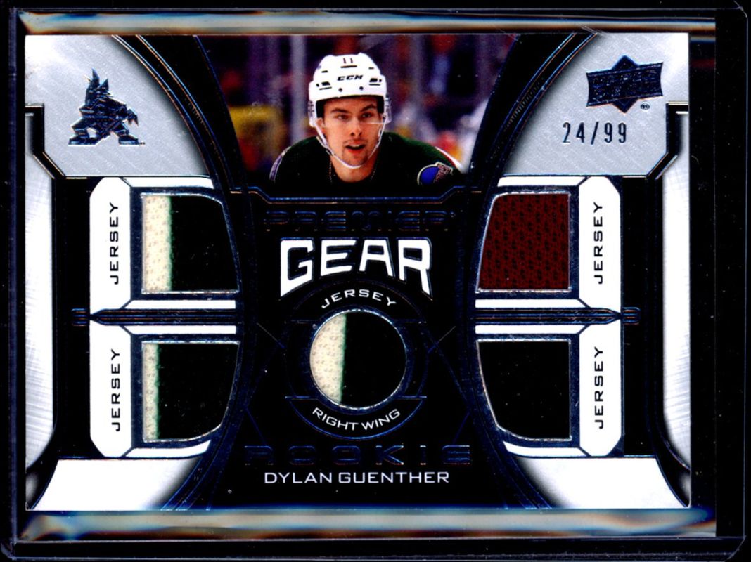 The Dylan Guenther 2022 Upper Deck Premier #PGR-DG Premier Gear Rookies - Jersey /99 card is 1 of 39 Dylan Guenther's card variations in the 2022 Upper Deck Premier set being tracked by Sports Card Investor, including Base /399, Autographs, Jersey, Rookies Bronze /199, and Gold /65.