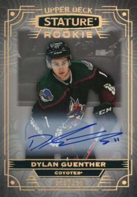 The Dylan Guenther 2022 Upper Deck Stature #111 Autographs /99 Rookie card is 1 of 47 Dylan Guenther's card variations in the 2022 Upper Deck Stature set being tracked by Sports Card Investor, including Base /399, Green /99, Photo Variant /99, Red /75, and Photo Variant Green /66.