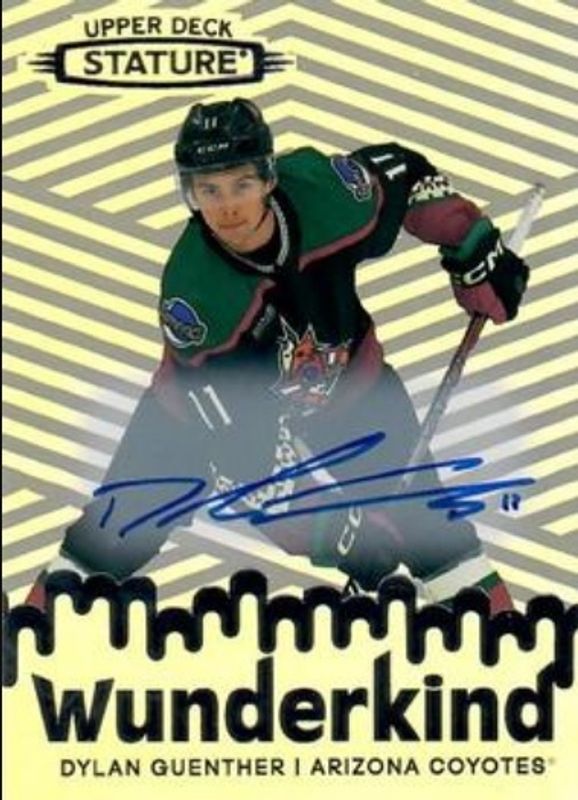The Dylan Guenther 2022 Upper Deck Stature #W-39 Wunderkind - Auto Rookie card is 1 of 47 Dylan Guenther's card variations in the 2022 Upper Deck Stature set being tracked by Sports Card Investor, including Base /399, Green /99, Photo Variant /99, Red /75, and Photo Variant Green /66.