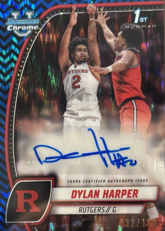 The Dylan Harper 2024 Bowman Chrome University #22 Prospect Auto - Black & Blue Stealth Refractor /100 (1st) card in Raw condition has not changed in price in the last 30 days and was last sold for $121.50 .