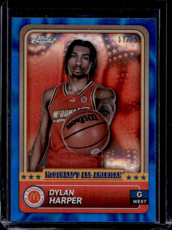 The Dylan Harper 2024 Topps Chrome McDonald's All-American #88 Blue Lava Refractor /75 card is 1 of 112 Dylan Harper's card variations in the 2024 Topps Chrome McDonald's All-American set being tracked by Sports Card Investor, including #88 Base, #38 Base, #38 Blue RayWave Refractor, #88 Blue RayWave Refractor, and #38 McDonald's Logo Refractor.