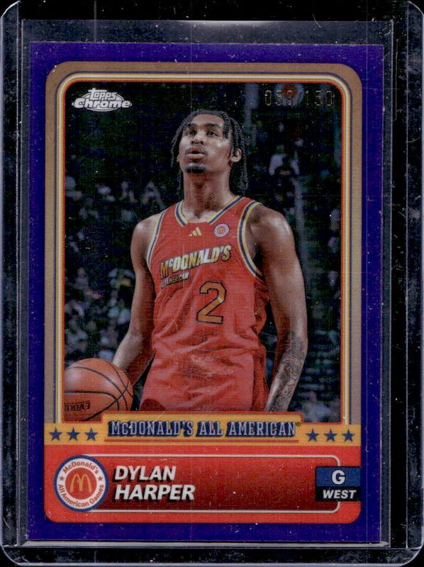 The Dylan Harper 2024 Topps Chrome McDonald's All-American #38 Purple Refractor /150 card is 1 of 112 Dylan Harper's card variations in the 2024 Topps Chrome McDonald's All-American set being tracked by Sports Card Investor, including #88 Base, #38 Base, #38 Blue RayWave Refractor, #88 Blue RayWave Refractor, and #38 McDonald's Logo Refractor.