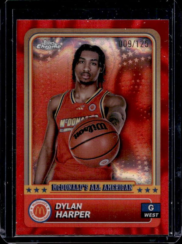 The Dylan Harper 2024 Topps Chrome McDonald's All-American #88 Red Lava Refractor /125 card is 1 of 112 Dylan Harper's card variations in the 2024 Topps Chrome McDonald's All-American set being tracked by Sports Card Investor, including #88 Base, #38 Base, #38 Blue RayWave Refractor, #88 Blue RayWave Refractor, and #38 McDonald's Logo Refractor.