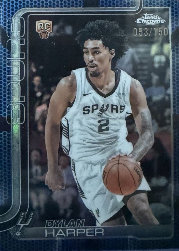 The Dylan Harper 2025 Topps Chrome #252 Blue Basketball Refractor /150 Rookie card in Raw condition has not changed in price in the last 30 days and was last sold for $139.00 .